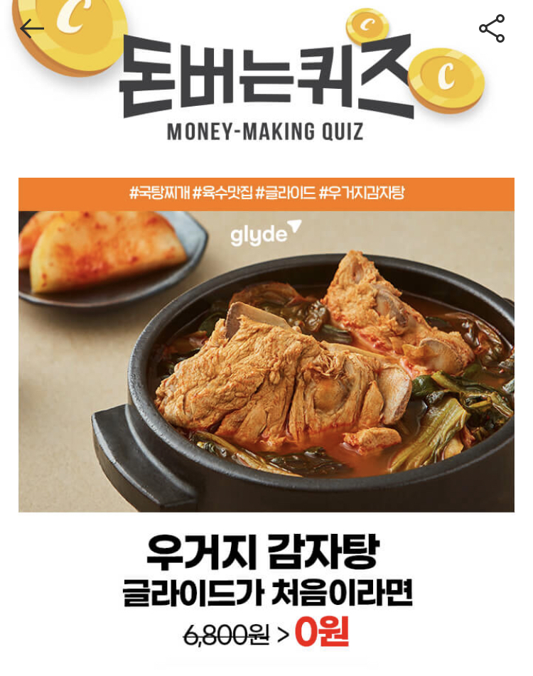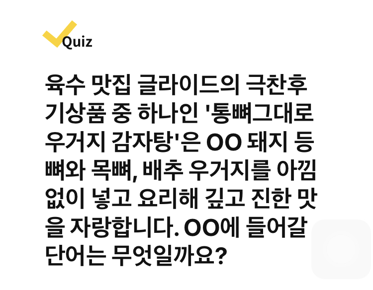 Quiz> 육수 맛집 글라이드의 극찬후기상품 중 하나인 '통뼈그대로 우거지 감자탕'은 OO 돼지 등뼈와 목뼈, 배추 우거지를 아낌없이 넣고 요리해 깊고 진한 맛을 자랑합니다. OO에 들어갈 단어는 무엇일까요?